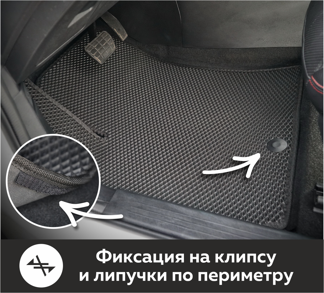 Коврики EVA надёжно крепятся с помощью оригинальных систем фиксации. Благодаря клипсам и липучке коврики защищены от смещений, что обеспечивает комфорт и безопасность вождения. Максимальное удобство также достигается точными, улучшенными лекалами для каждого автомобиля.