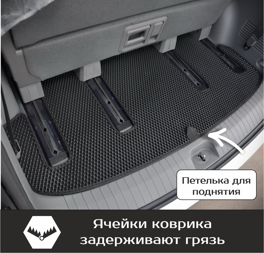 Изделия EVA имеют специальную ячеистую структуру (ячейки глубиной 8 мм), которая эффективно задерживает грязь и воду, оставляя вашу обувь и поверхность обивки салона или багажника абсолютно чистыми. Также эти ячейки очень легко и быстро очищаются без применения специальных инструментов, в том числе, при помощи бесконтактной мойки.